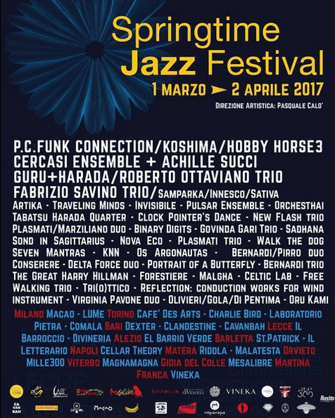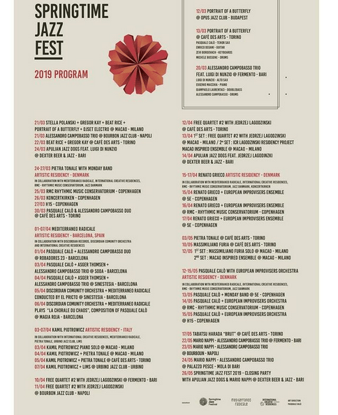 Springtime Jazz Festival , created by the platform for artistic research and production Mediterraneo Radicale and the Associazione Culturale Springtime Jazz Festival, is an itinerant contemporary jazz and experimental music festival that is held in various european and american cities during Spring in the northern hemisphere.